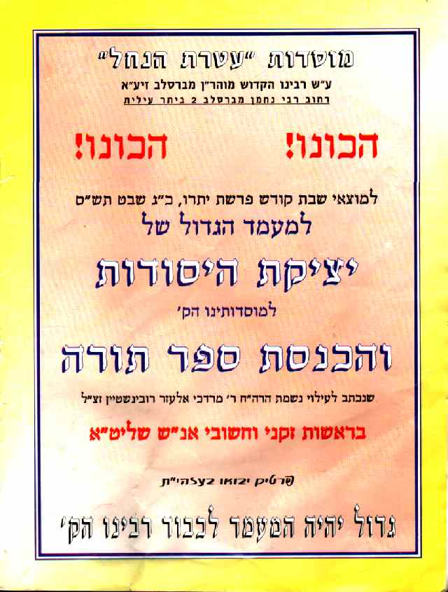 For information contact the Main Office: Rabbi Nachman MiBreslov Street P.O.Box 678 Beitar Elite, 99879 ISRAEL Tel +972 (2) 580-8536