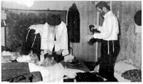 full of army bunk beds. In the kitchen area, a team of plastic aproned