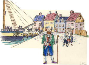 captain was dressed in a blue velvet coat with brass buttons, and a long sword