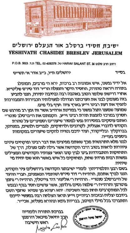Haskama (Letter of Approbation) From HaRav Michel Dorfman,